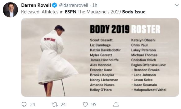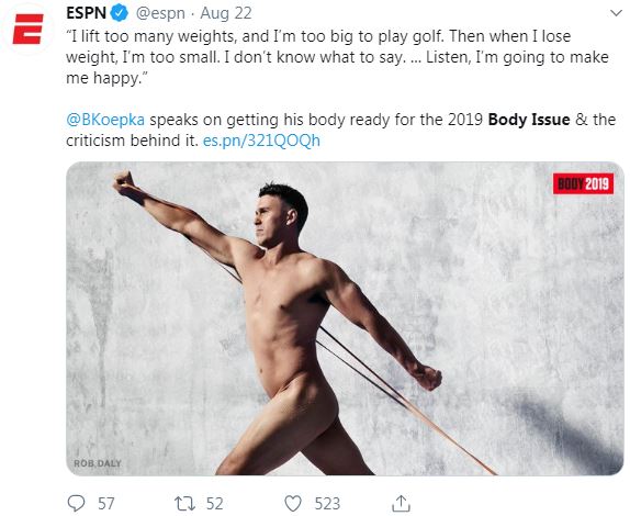 - World #1, Brooks Koepka, made quite the stir last week with his riske picture for the ESPN body issue. This will be the last time ESPN creates the magazine which drops on Sept 4th! Other athletes featured: Christian Yelich, Eagles O-Line, UCLA gymnast Ohashi and OKC guard Chris Paul