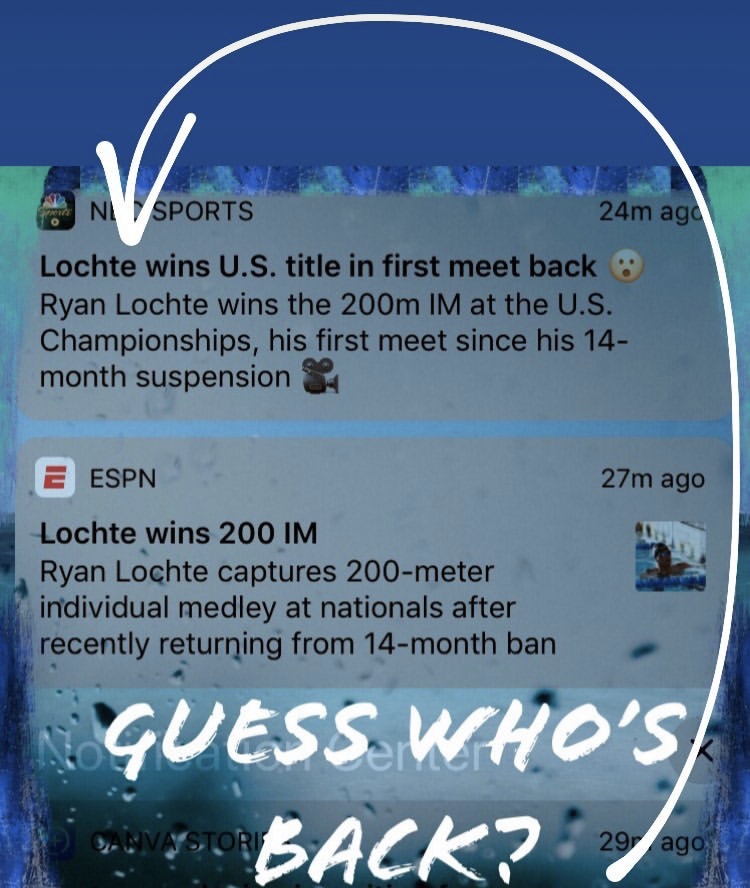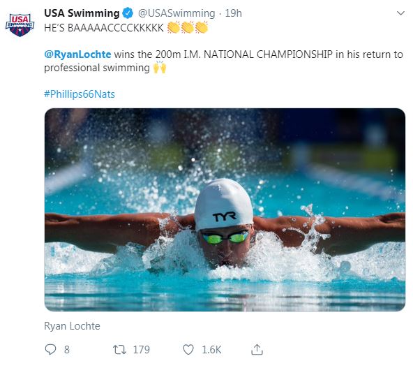 - Ryan Lochte won his first race back after suspension, the 200m IM, at the US national meet in California. He was banned for 14 months after using an infusion of vitamin B12 above the legal limit. He won the event by 1.07.