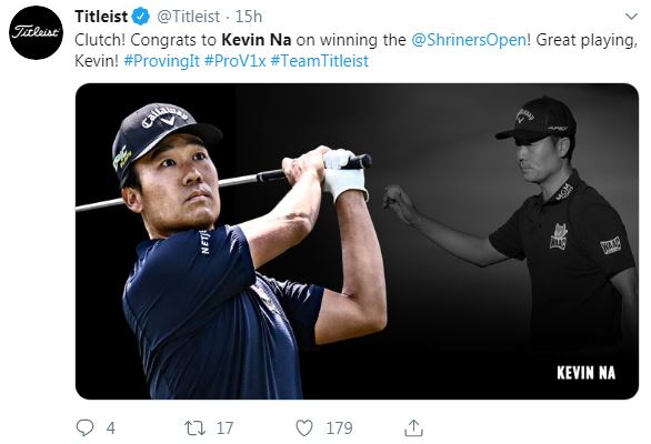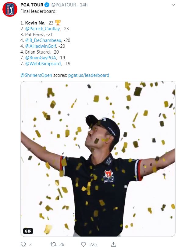 - Kevin Na, mostly known for his quick walk to pick up a putt in the hole, won the Shriners Open this weekend in Vegas. Na had a 3 stroke lead going into the back nine, blew that, made a 25 ft par putt on 17 and beat Patrick Cantlay in a playoff to take the title. Cantlay who had played well all tournament, 3 putted the playoff hole to give Na the victory.